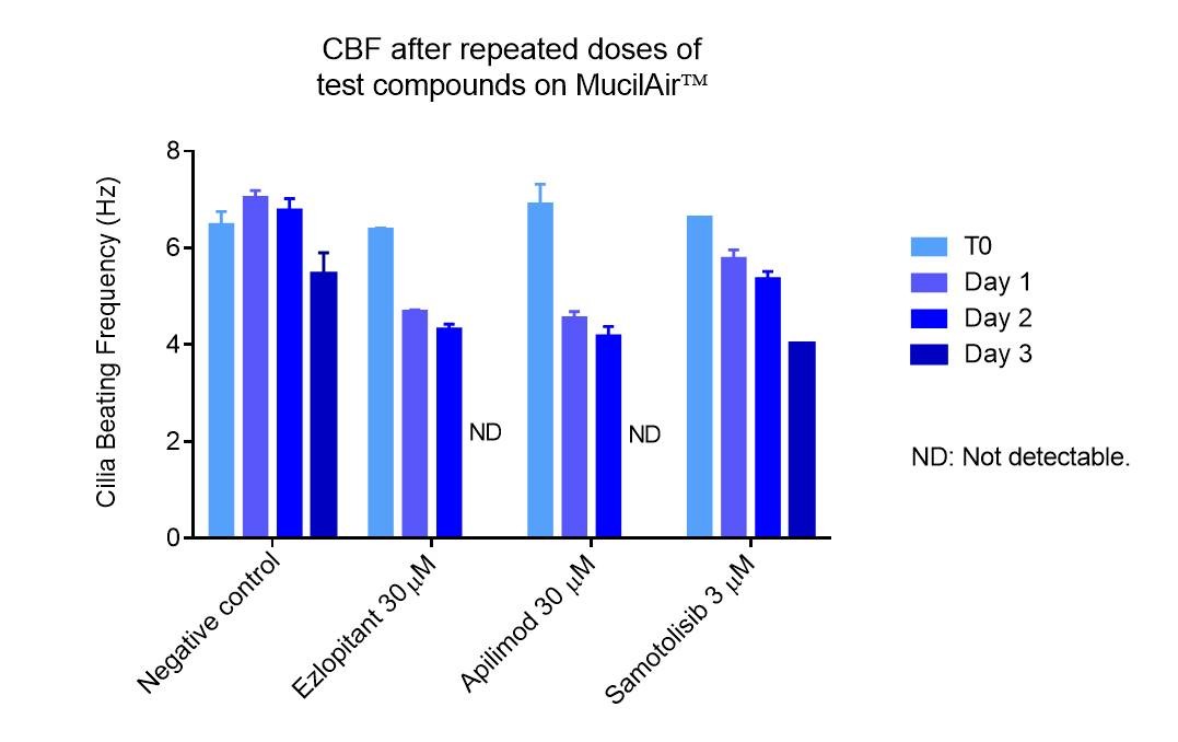 Example of ciliopathic effect after repeated dose basal exposure of APIs. Partial or total inhibition of Cilia Beating Frequency is easily monitored on MucilAir™ using Cilia-X.